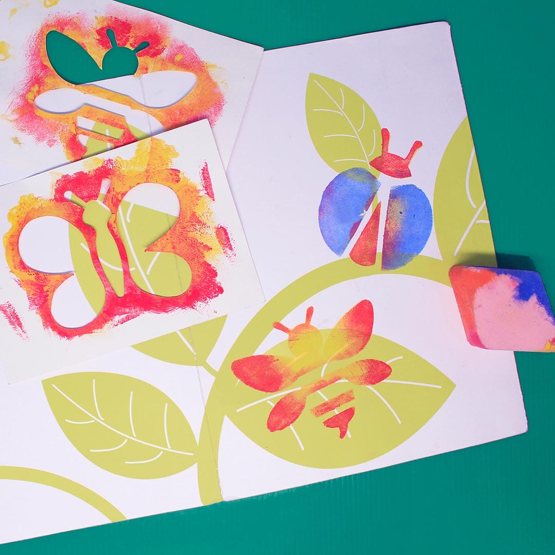 Paint caterpillars, spiders, ladybugs and more bugs with this convenient set of paints and stencils. Mix colors to create your colorful creatures and tell picture stories about their lives in Bugland! Includes 6 reusable paper stencils, 3 paint colors, 4 brushes and sponges, palette and an apron.