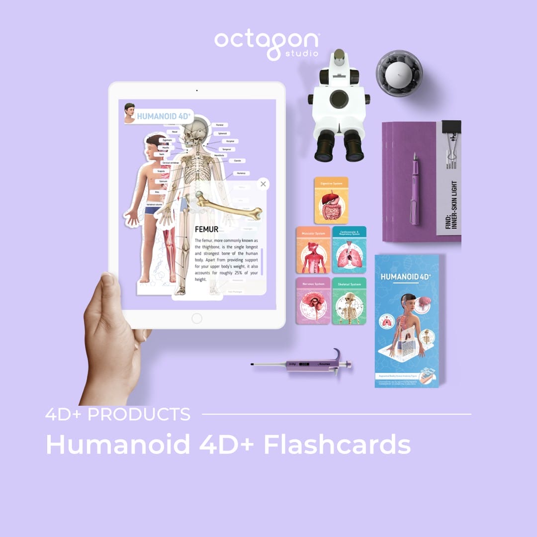Have you ever wondered how your voice box works? Or how thousands of tiny receptors on your tongue help you distinguish all sorts of different flavors? Introducing Humanoid 4D+, a set of educational flash cards that work with an augmented reality app that creates interactive illustrations of human anatomy, its various systems and how they work. This visually-driven app enables kids to explore their muscular, skeletal, respiratory, nervous systems and more in a fun and interactive way!